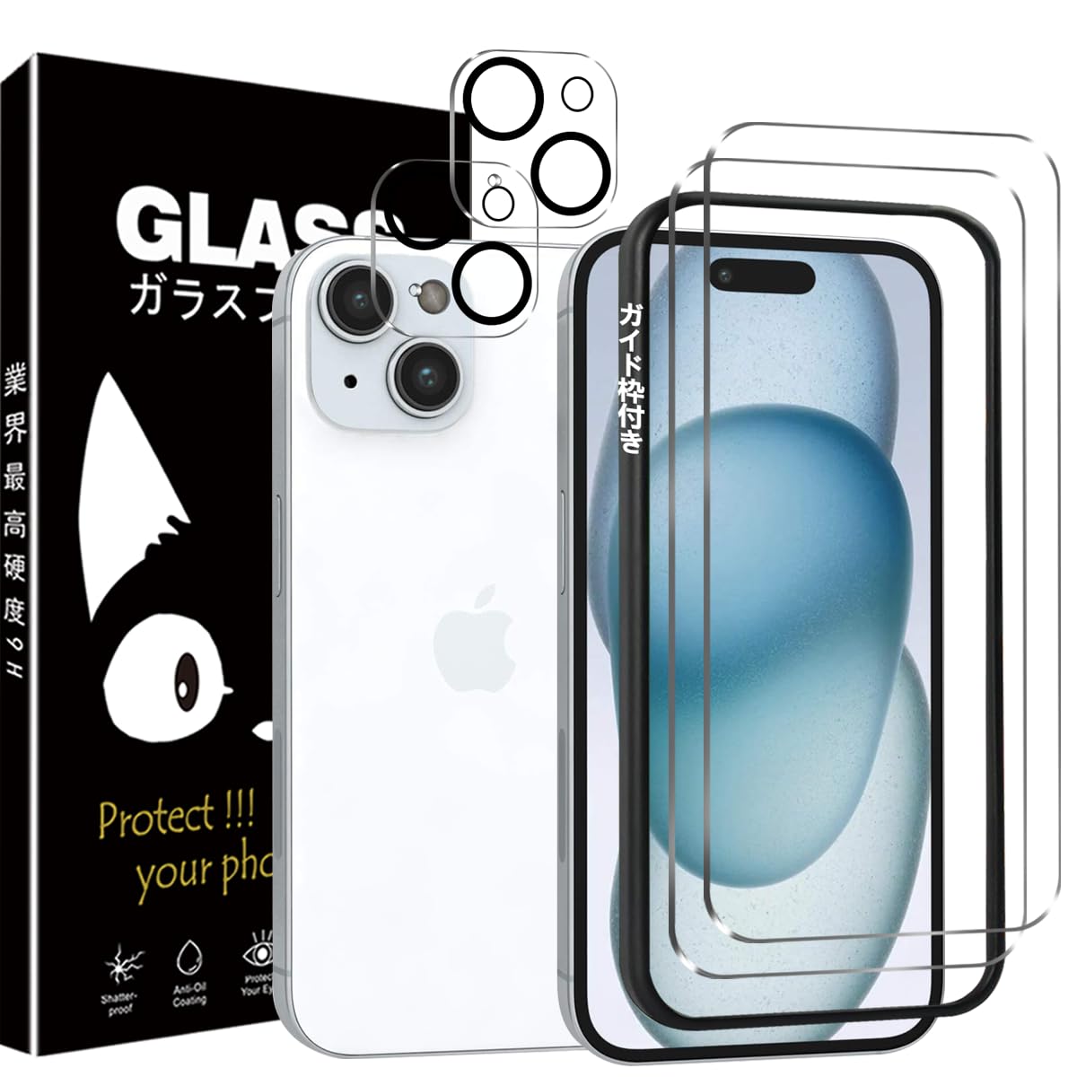 Huy iphone 15 ガラスフィルム【ガイド枠】- 旭硝子仕様 アイフォン15 保護フィルム 2枚 + いphone15 フィルム カメラ 2枚 iphone 15 用の 強化ガラスフィルム 硬度9H 高 透過率 耐衝撃 飛散防止 傷防止 耐指紋 気泡ゼロ 撥油性 自動吸着