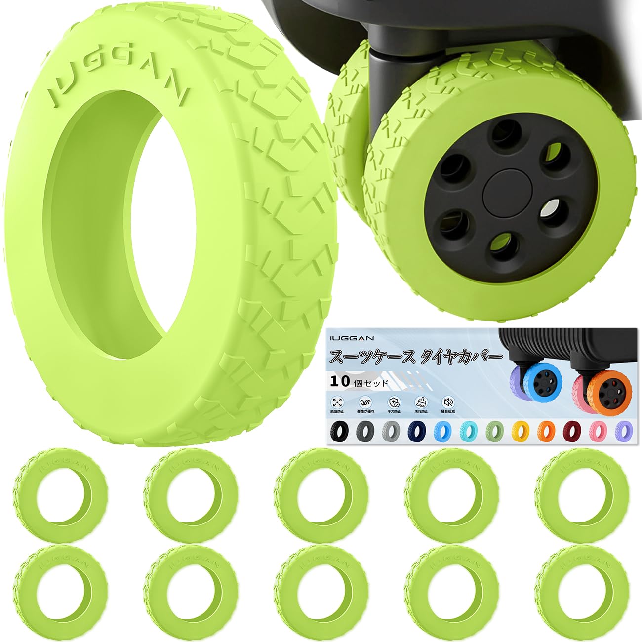 [IUGGAN] キャスターカバー スーツケース タイヤカバー 10個セッド キャリーケース 車輪カバー キャリーバッグホイールカバー シリコン 傷防止 静音 汚れ 転がり防止 荷物保護 地面保護 荷物用ホイールカバー 旅行用 車輪保護用 (矢印, グリーン(夜光効果付き), Mサイズ(5~5.5cmの車輪に適合))