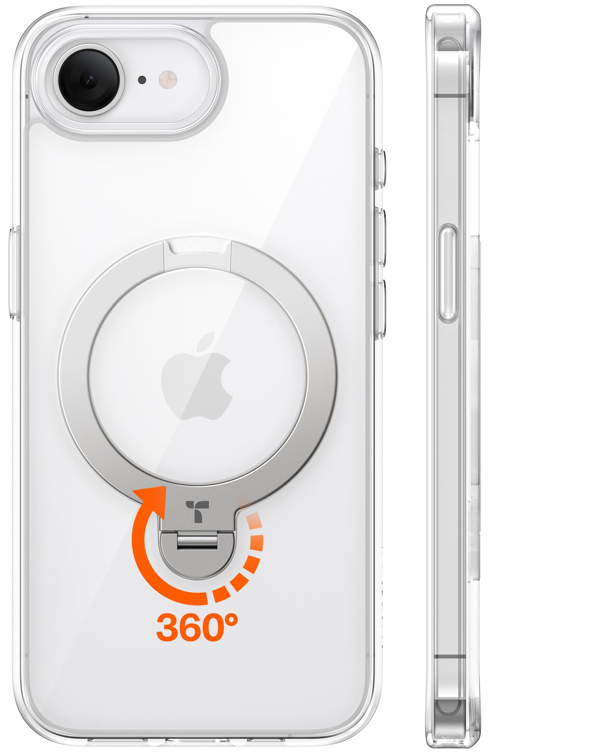 TORRAS iPhone 16e 用 ケース【超剛性|360° ゼンマイ式スタンド × 10 万回開閉耐久】 米軍規格 縦横両対応 リング付き マグネット搭載 ワイヤレス充電対応 耐衝撃 防指紋 半透明 Ostand Spin クリア