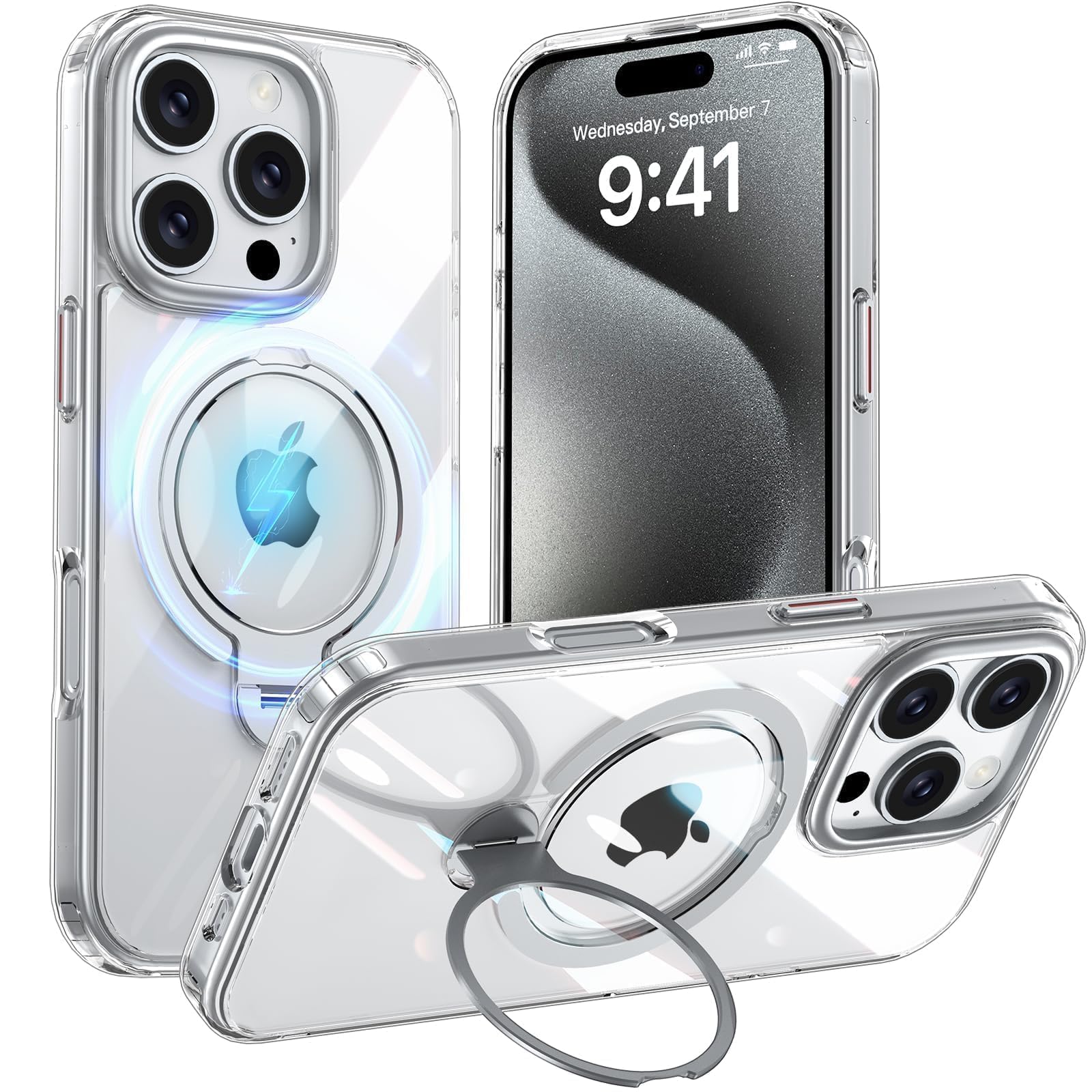 Fadkzyxr iPhone 16 Pro 用 ケース MagSafe対応 リング360°回転スタンド機能 縦横両対応 透明 黄ばみ防止 ワイヤレス充電 いphone16 Pro スマホケース レンズ保護 米軍規格 耐衝撃 携帯カバー アイフォン 16 プロ ケース マグネット搭載 車載ホルダー マグセーフ対応 おしゃれ クリア