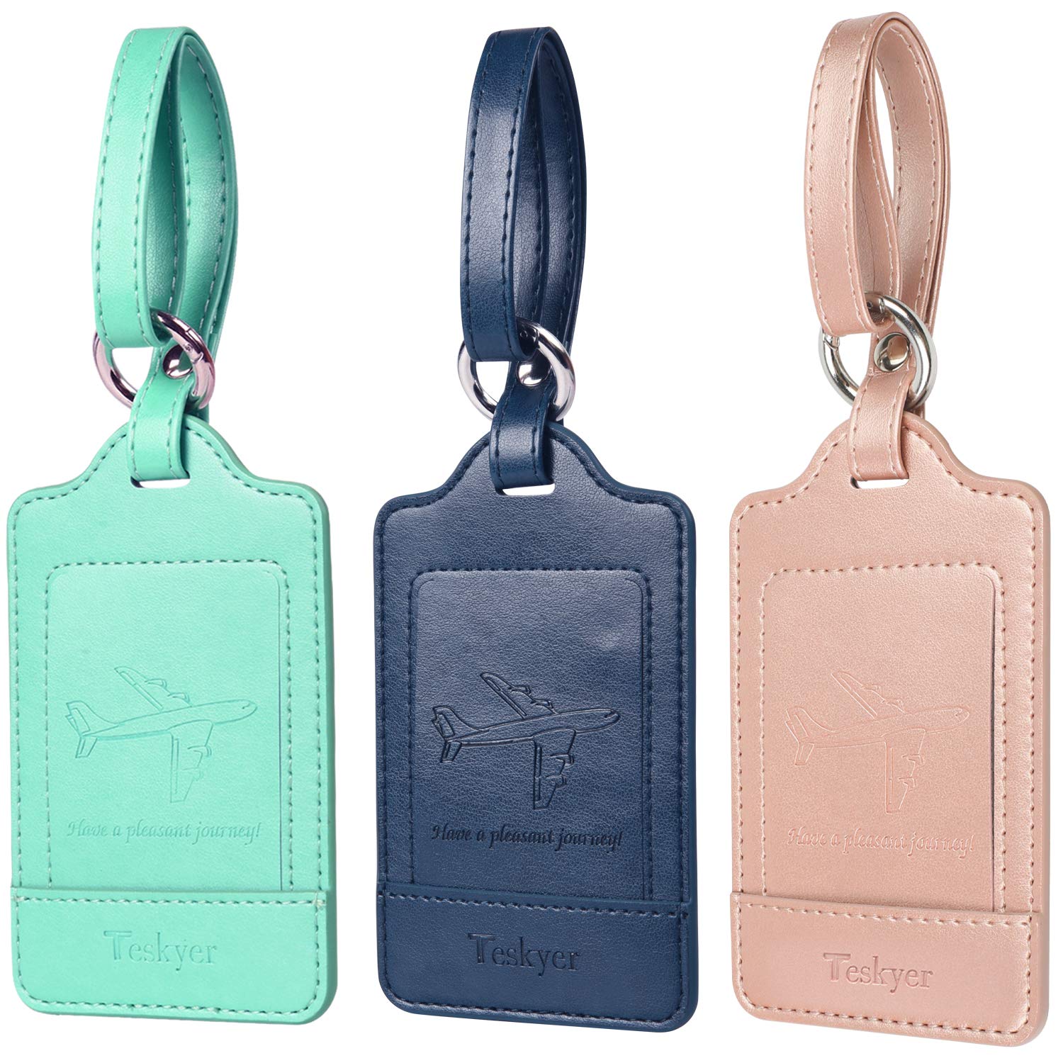 Teskyer 荷物タグ スーツケースタグ 出張用タグ ネームタグ 番号札 バッグ用ネームタグ レザー 旅行タグ トラベル用 旅行手荷物 ラベル 紛失防止 三枚入り(ネイビー+ローズゴールド+グリーン)