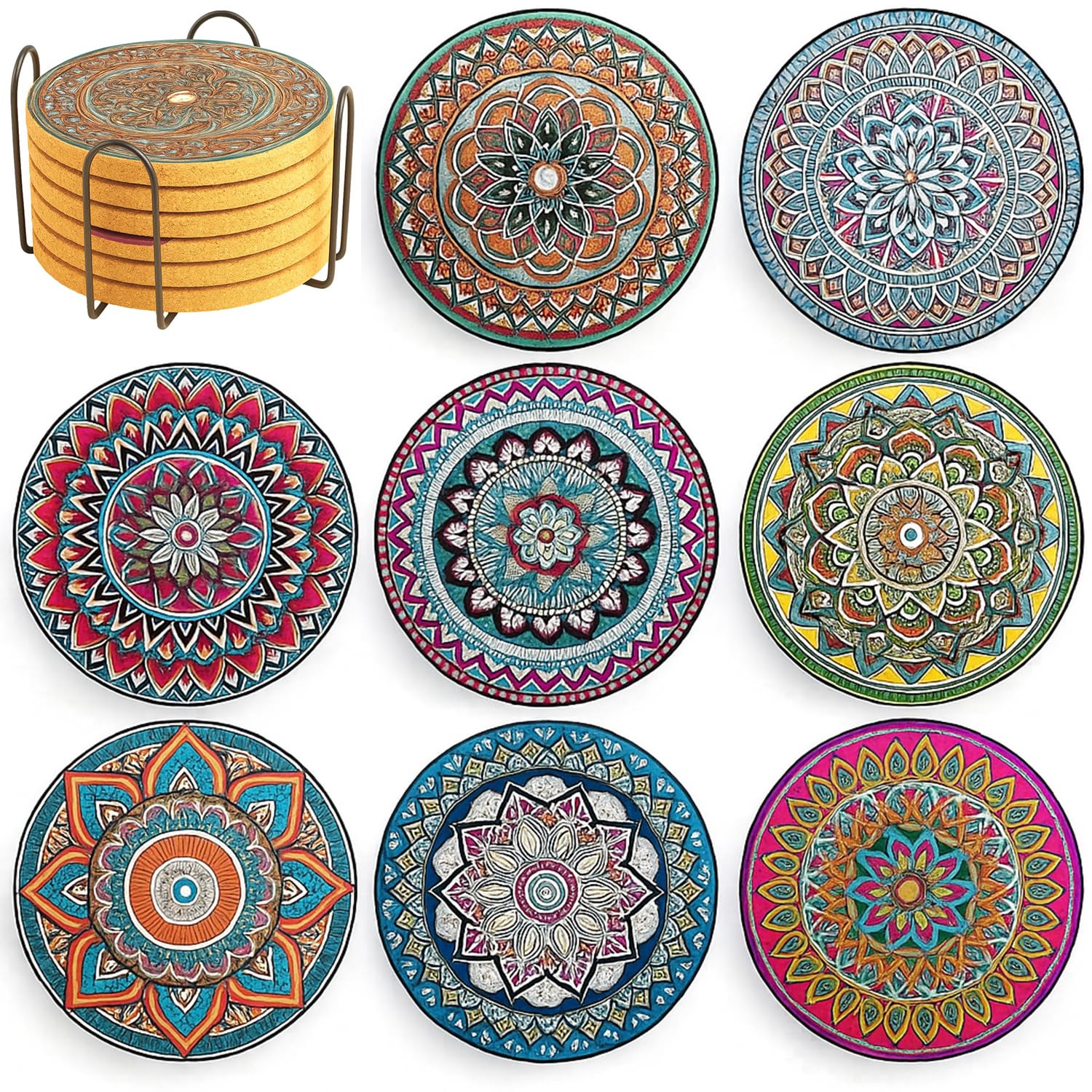 [Queen-b] コースター 8個セット マンダラ柄 スタンド付き 丸型 円形 おしゃれ カラフル ダイヤモンド アート かわいい コルク 裏面 滑り止め 吸水 速乾 お茶 オフィス カフェ